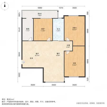 彩虹新城 3室2厅1卫 114.56㎡